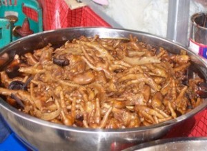 For all of you who know me, you know how much I like chicken nuggets. So we were at this market called Chutuchuck (we took this cool sky train, sort of like a monorail). At this giant food court, I looked into this bucket, and this is what I saw. I asked my Mom what it was, and she said “chicken nuggets.” Well, you be the judge. Would you eat this? Maybe KFC could start selling this stuff. What do you think? Any takers?