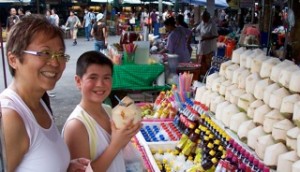Move over Gaterade. I saw this article on the Internet on how athletes that drink coconut juice do even better than when they drink Gaterade. So my Mom and I tried some at the weekend market. It was SOOOOO good! The man in the booth took a machete and boom, he took off the top and there it was. It so, so hot but the guy had these in a cooler on ice, and it felt so good to drink it. It cost about 40 baht (a little over $1). I wish they had these in Steamboat!