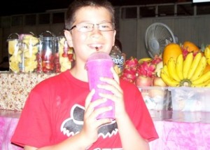 Check out this smoothie — made with dragon fruit and bananas. That deep purple color is what the fruit looks like. They only added ice, and it was SOOOOO good. The dragon fruit is purple in the middle, and has spikes. You can see one just to the right of my shoulder, and to the left of the bananas. Who wants one now? BTW, about a buck for the smoothie, sometimes less.
