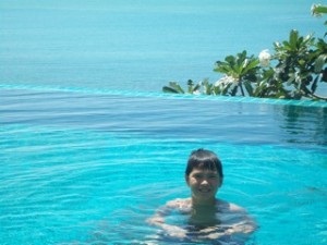 Koh Samui is an island in Southern Thailand. We took an overnight VIP bus from Bangkok, and then the bus got on a ferry first thing in the morning. We sat on top of the ferry. Then, the bus took us to the bus station where we got a taxi to our hotel. Here are some picture of me swimming in Koh Samui and a picture from the beach. Any one want to join me?