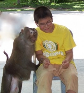 After the Tiger Kingdom, we went to the monkey centre. They had a monkey show where they played basketball, and we fed monkeys with bananas and small apples. My Dad said they reminded him of me! I was even in the main show and they brought me out of my seat where a monkey untied my hands!
