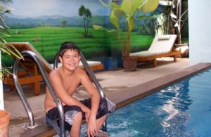 It’s off-season in Koh Samui, so there’s hardly anyone hanging around the pool. It’s like having my own private pool. We use the pool, get around town with motor scooters, and drink fruit smoothies. I also eat a lot of sticky rice and mangoes. I LOVE MANGOES!