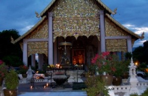 The Sunday night market goes for so many blocks I lost track. It’s the biggest market in Chiang Mai and you can buy just about anything! I got a lot of cool stuff, including a couple of things that you blow into that sounds like a real bird. They had cotton candy that they made right in front of you, people playing music, lots of food vendors, and people making hats. I got some stuff for my friends at the market. It’s really about 100 x bigger than the Steamboat farmers market and I’m not kidding. There are a l0t of Buddhist temples where people make special offerings. They looked really pretty at sundown.
