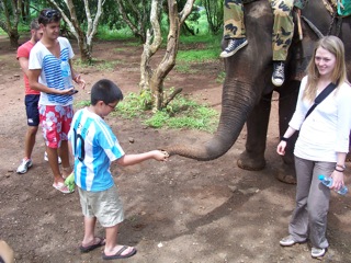 Wow, what a day! Today, my Dad took me on a one-day trek out of Chiang Mai. Our first stop was a trek on elephants through the jungle. I bought some bananas to feed my elephant. Then, we went on a hike to this awesome waterfall. At the end of the trail, we could swim in a natural pool under the waterfall. The water was so warm! After that, we went white water rafting and it was my first time doing that. The rapids were really running, but again, the water was warm! I almost didn’t go because it looked