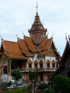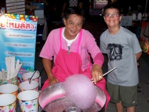 The Sunday night market goes for so many blocks I lost track. It’s the biggest market in Chiang Mai and you can buy just about anything! I got a lot of cool stuff, including a couple of things that you blow into that sounds like a real bird. They had cotton candy that they made right in front of you, people playing music, lots of food vendors, and people making hats. I got some stuff for my friends at the market. It’s really about 100 x bigger than the Steamboat farmers market and I’m not kidding. There are a l0t of Buddhist temples where people make special offerings. They looked really pretty at sundown.